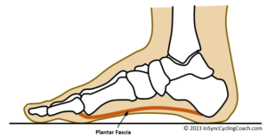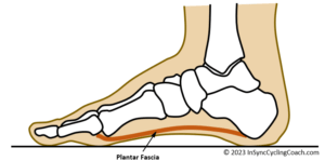 The plantar fascia is a band of tissue (fascia) that connects your heel bone to the MTP (metatarsophalangeal) joints. As we walk and run, plantar fascia tension changes, providing effective proprioceptive feedback to the brain. Conversely, when we press down on the pedals through a typical cycling shoe, there is little or no change in plantar fascia tension. This is because (almost all) cycling shoes have an arch support which is so flimsy there is little or no meaningful contact between the insole and the arch of the foot. By meaningful, I mean the insole provides little or no resistance to the compression of the arch, caused by pressing down on the pedals. This means that when cycling, the brain does not get the proprioceptive feedback it needs to determine where the feet are in space.